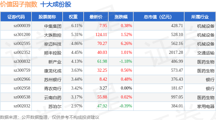 证券之星消息,11月6日,价值因子(980056)指数报收于2627.82点,涨1.32%,成交500.32亿元,换手率1.49%。当日该指数成份股中,上涨的有37家,潍柴动力以10.01%的涨幅领涨,下跌的有12家,大金重工以2.84%的跌幅领跌。