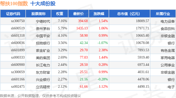 帮扶100(980065)指数十大成份股详情如下: