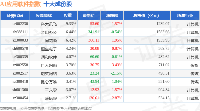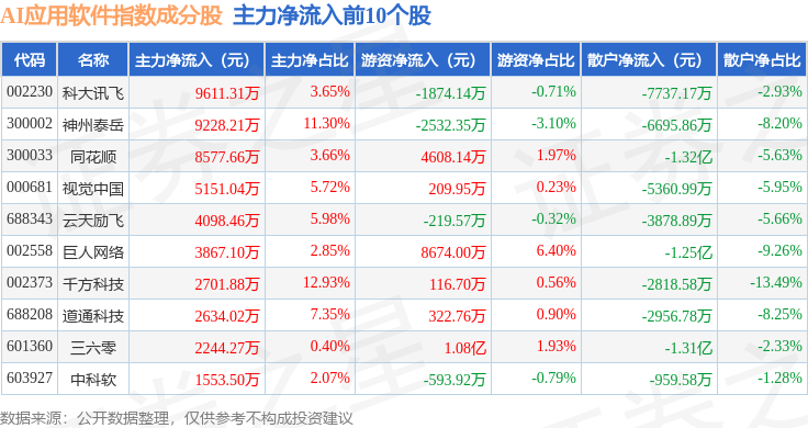 资金流向方面,AI应用软件(980107)指数成份股当日主力资金净流出合计20.3亿元,游资资金净流入合计6.78亿元,散户资金净流入合计13.52亿元。成份股资金流向详情见下表:
