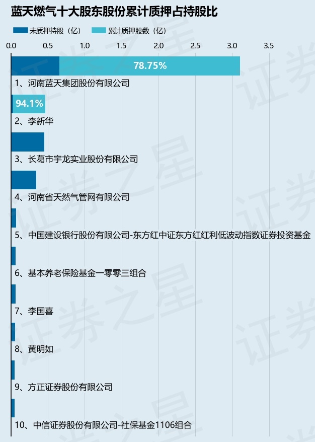 截止本公告日,股东河南蓝天集团股份有限公司已累计质押股份2.45亿股,占其持股总数的78.75%,股东李新华已累计质押股份4400.0万股,占其持股总数的94.1%。本次质押后蓝天燃气十大股东的累计质押股份占持股比例(占持股比例的计算以公司最新一期财务报表公布的十大股东的持股总数为基准)见下图:
