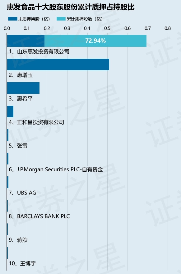截止本公告日,股东山东惠发投资有限公司已累计质押股份5070.0万股,占其持股总数的72.94%。本次质押后惠发食品十大股东的累计质押股份占持股比例(占持股比例的计算以公司最新一期财务报表公布的十大股东的持股总数为基准)见下图: