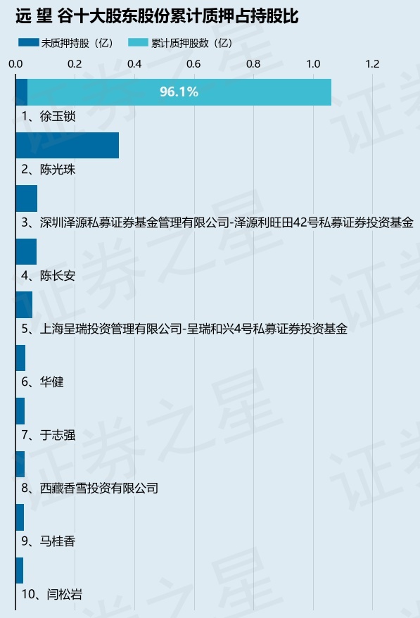 截止本公告日,股东徐玉锁已累计质押股份1.02亿股,占其持股总数的96.1%。本次质押后远 望 谷十大股东的累计质押股份占持股比例(占持股比例的计算以公司最新一期财务报表公布的十大股东的持股总数为基准)见下图: