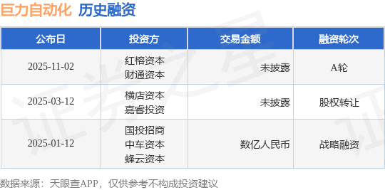 证券之星消息,根据天眼查APP于11月2日公布的信息整理,巨力自动化设备(浙江)有限公司A轮融资,融资额未披露,参与投资的机构包括红榕资本,财通资本。