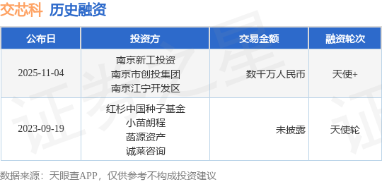 证券之星消息,根据天眼查APP于11月4日公布的信息整理,交芯科(上海)智能科技有限公司天使+融资,融资额数千万人民币,参与投资的机构包括南京新工投资,南京市创投集团,南京江宁开发区。