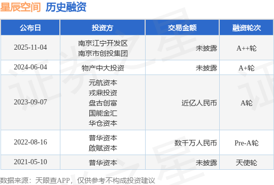 证券之星消息,根据天眼查APP于11月4日公布的信息整理,南京星辰空间科技有限公司A++轮融资,融资额未披露,参与投资的机构包括南京江宁开发区,南京市创投集团。