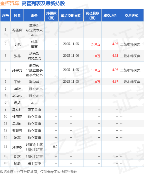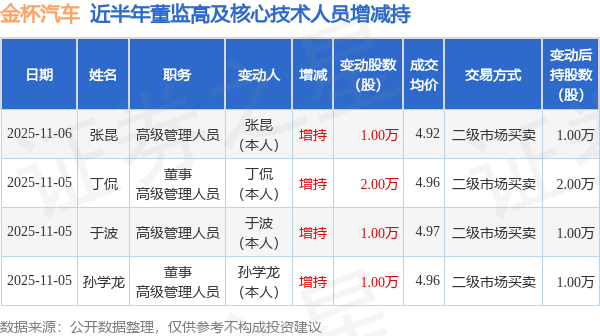 金杯汽车近半年内的董监高及核心技术人员增减持详情如下: