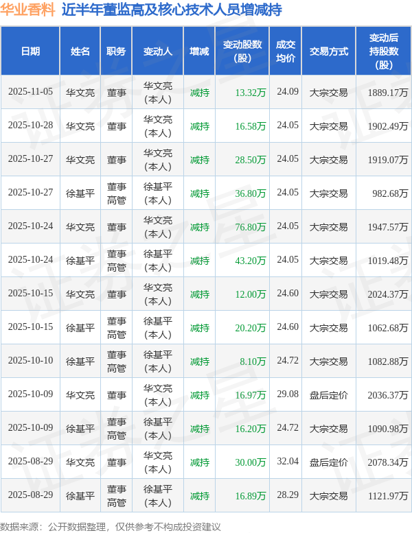 华业香料近半年内的董监高及核心技术人员增减持详情如下: