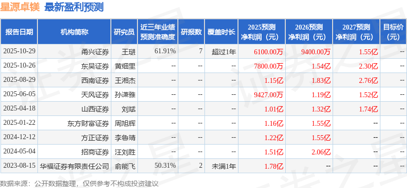 证券之星数据中心根据近三年发布的研报数据计算,甬兴证券王琎研究员团队对该股研究较为深入,近三年预测准确度均值为61.91%,其预测2025年度归属净利润为盈利6100万,根据现价换算的预测PE为101.22。
