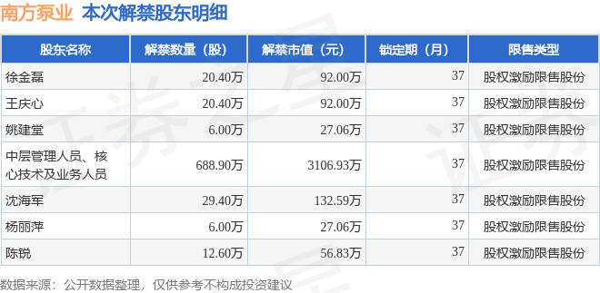 证券之星消息,根据市场公开信息整理,南方泵业(300145)于11月7日将有783.7万股限售股份解禁,为公司股权激励限售股份,占公司总股本0.41%。(本次数据根据历史公告整理得出,实际情况以上市公司最新公告为准)本次解禁后,公司还有904.0万股限售股份,占总股本0.47%。具体如下图所示: