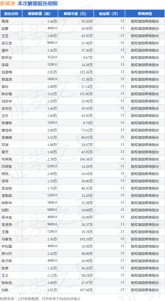 证券之星消息,根据市场公开信息整理,新威凌(920634)于11月7日将有53.31万股限售股份解禁,为公司股权激励限售股份,占公司总股本0.83%。(本次数据根据历史公告整理得出,实际情况以上市公司最新公告为准)最近一年内,该股累计解禁721.66万股,占总股本的11.29%。本次解禁后,公司还有2345.36万股限售股份,占总股本36.7%。具体如下图所示: