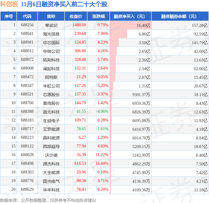 科创板融资净买入前三分别为:寒武纪(688256)融资净买入16.4亿元、海光信息(688041)融资净买入6.86亿元、中芯国际(688981)融资净买入3.5亿元,前20具体见下表: