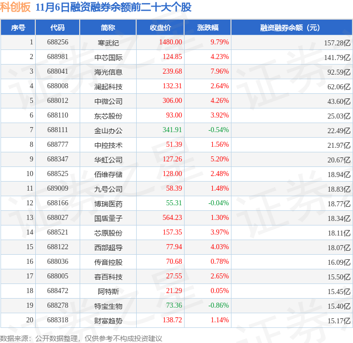 科创板融资融券余额前三分别为:寒武纪(688256)融资融券余额157.28亿元、中芯国际(688981)融资融券余额141.79亿元、海光信息(688041)融资融券余额92.59亿元,前20具体见下表: