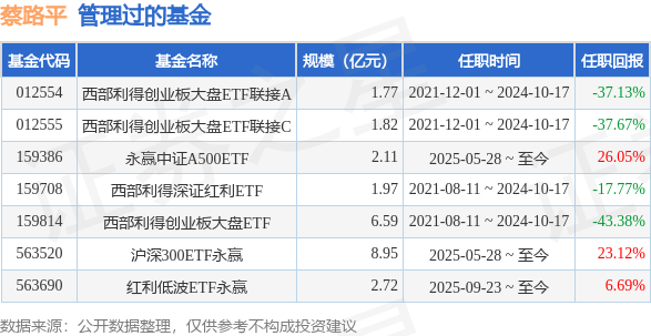 蔡路平先生:中国国籍,美国哥伦比亚大学统计学硕士。曾任DIA@Associates数据分析师、南华基金管理有限公司基金经理助理、永嬴基金管理有限公司基金经理助理。2021年6月加入西部利得基金管理有限公司,具有基金从业资格。2021年8月11日至2024年10月17日担任西部利得创业板大盘交易型开放式指数证券投资基金基金经理。2021年8月11日至2024年10月17日担任西部利得深证红利交易型开放式指数证券投资基金的基金经理。2025年5月28日担任永赢沪深300交易型开放式指数证券投资基金基金经理。2025年5月28日担任永赢中证A500交易型开放式指数证券投资基金基金经理。