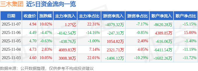 证券之星消息,三木集团11月7日涨停收盘,收盘价4.94元。该股于9点32分涨停,1次打开涨停,截止收盘封单资金为3681.18万元,占其流通市值1.6%。