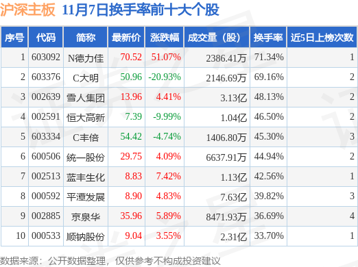 当日沪深主板换手率前10大个股中7只个股收涨,平均涨幅11.61%,其中N德力佳(603092)以换手率71.34%排第一,7只个股近5个交易日中多次上榜。