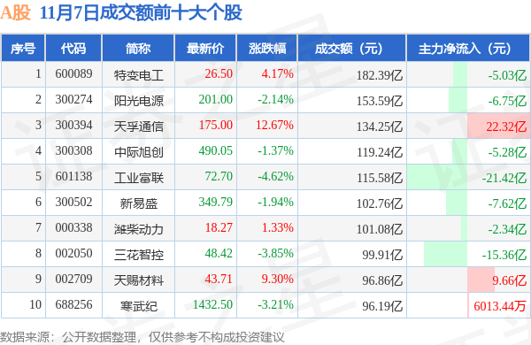 当日A股成交额前10大个股中4只个股收涨,平均涨幅6.87%,其中特变电工(600089)以成交额182.39亿元排第一。从主力资金流入看,成交额前10大个股中有3只个股呈现主力资金净流入。