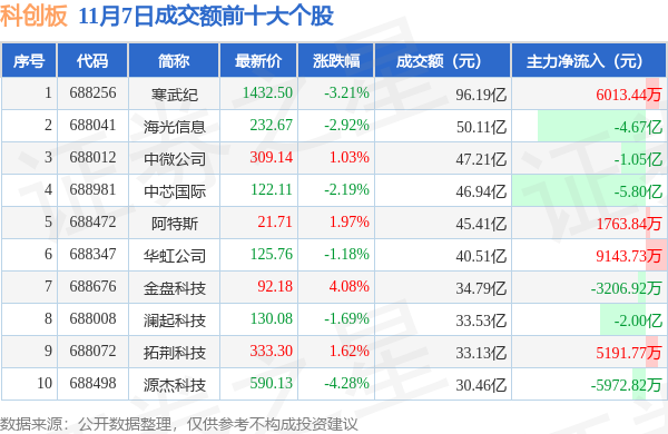 当日科创板成交额前10大个股中4只个股收涨,平均涨幅2.17%,其中寒武纪(688256)以成交额96.19亿元排第一。从主力资金流入看,成交额前10大个股中有4只个股呈现主力资金净流入。