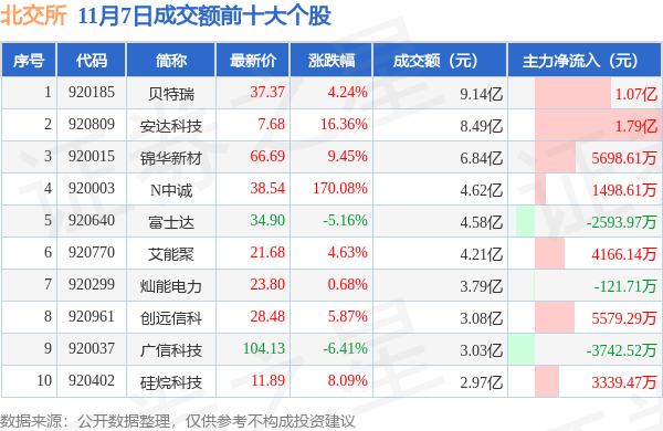 当日北交所成交额前10大个股中8只个股收涨,平均涨幅27.43%,其中贝特瑞(920185)以成交额9.14亿元排第一。从主力资金流入看,成交额前10大个股中有7只个股呈现主力资金净流入。