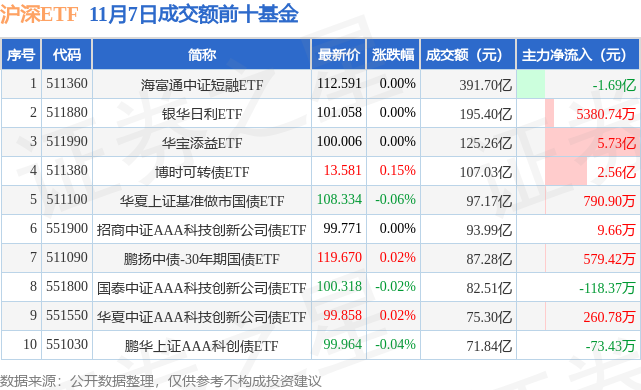 当日沪深ETF成交额前10大ETF基金中3只ETF基金收涨,平均涨幅0.06%,其中短融ETF(511360)以成交额391.7亿元排第一。从主力资金流入看,成交额前10大ETF基金中有7只ETF基金呈现主力资金净流入。
