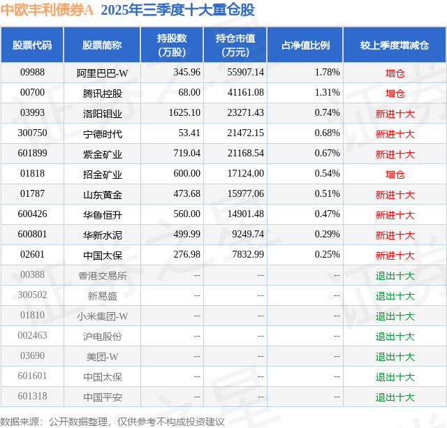 根据2025基金Q3季报公募基金重仓股数据,重仓该股的公募基金共23家,其中持有数量最多的公募基金为中欧基金的中欧丰利债券A。中欧丰利债券A目前规模为273.6亿元,最新净值1.1449(11月6日),较上一交易日上涨0.35%,近一年上涨9.36%。该公募基金现任基金经理为华李成。华李成在任的基金产品包括:中欧瑾通灵活配置混合A,管理时间为2018年3月29日至今,期间收益率为57.79%;中欧瑾利混合A,管理时间为2020年12月30日至今,期间收益率为17.9%;中欧融益稳健一年混合A,管理时间为2021年3月4日至今,期间收益率为17.2%;中欧精益稳健一年持有混合,管理时间为2021年6月10日至今,期间收益率为12.65%。