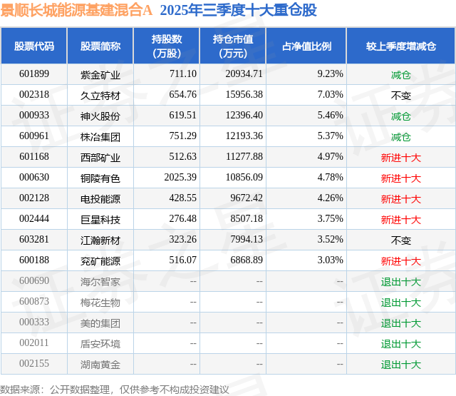 根据2025基金Q3季报公募基金重仓股数据,重仓该股的公募基金共2家,其中持有数量最多的公募基金为景顺长城基金的景顺长城能源基建混合A。景顺长城能源基建混合A目前规模为20.61亿元,最新净值2.99(11月6日),较上一交易日上涨2.26%,近一年上涨20.81%。该公募基金现任基金经理为邹立虎。邹立虎在任的基金产品包括:景顺长城安盈回报一年持有混合A,管理时间为2021年11月16日至今,期间收益率为42.06%;景顺长城景盛双息收益债券A,管理时间为2022年1月29日至今,期间收益率为22.8%;景顺景颐招利6个月持有期债券A,管理时间为2022年3月12日至今,期间收益率为26.89%;景顺长城华城稳健6个月持有期混合A,管理时间为2022年3月12日至今,期间收益率为30.67%。