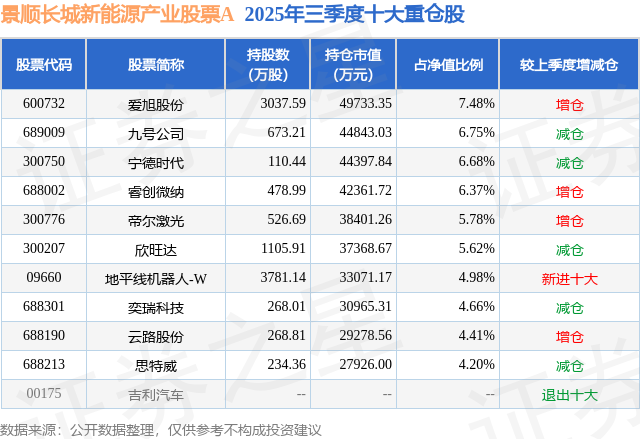 根据2025基金Q3季报公募基金重仓股数据,重仓该股的公募基金共9家,其中持有数量最多的公募基金为景顺长城基金的景顺长城新能源产业股票A。景顺长城新能源产业股票A目前规模为24.68亿元,最新净值1.477(11月6日),较上一交易日上涨0.94%,近一年上涨33.46%。该公募基金现任基金经理为杨锐文 曾英捷。杨锐文在任的基金产品包括:景顺长城优选混合,管理时间为2014年10月25日至今,期间收益率为326.28%;景顺长城环保优势股票,管理时间为2016年3月15日至今,期间收益率为301.0%;景顺长城创新成长混合,管理时间为2019年10月17日至今,期间收益率为97.6%;景顺长城成长领航混合,管理时间为2020年5月28日至今,期间收益率为65.44%。
