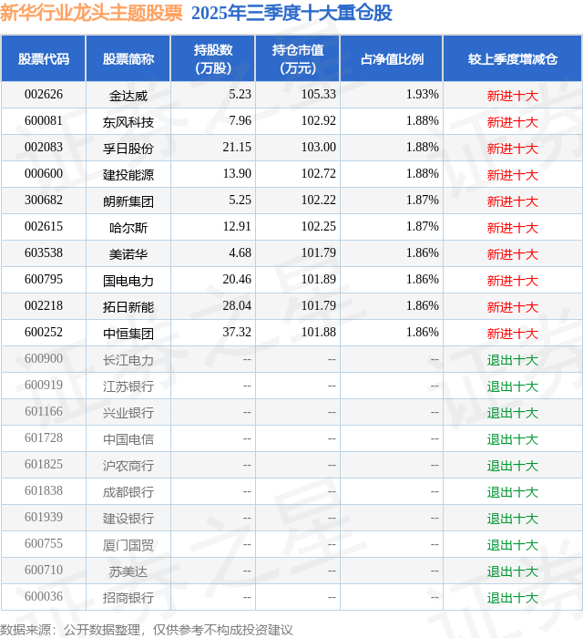 根据2025基金Q3季报公募基金重仓股数据,重仓该股的公募基金共1家,其中持有数量最多的公募基金为新华基金的新华行业龙头主题股票。新华行业龙头主题股票目前规模为0.55亿元,最新净值0.6739(11月6日),较上一交易日上涨0.3%,近一年下跌3.04%。该公募基金现任基金经理为张大江 林翟。林翟在任的基金产品包括:新华积极价值灵活配置混合A,管理时间为2025年6月12日至今,期间收益率为16.06%;新华双利债券A,管理时间为2025年7月23日至今,期间收益率为1.24%;张大江在任的基金产品包括:新华行业周期轮换混合A,管理时间为2023年1月9日至今,期间收益率为21.08%;新华行业灵活配置混合A,管理时间为2024年4月12日至今,期间收益率为-4.66%;新华鑫益灵活配置混合A,管理时间为2024年11月13日至今,期间收益率为2.66%;