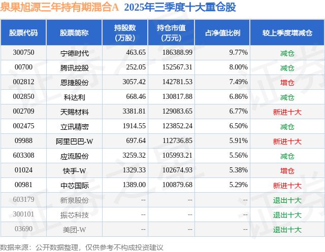 根据2025基金Q3季报公募基金重仓股数据,重仓该股的公募基金共176家,其中持有数量最多的公募基金为泉果基金的泉果旭源三年持有期混合A。泉果旭源三年持有期混合A目前规模为163.29亿元,最新净值1.109(11月6日),较上一交易日上涨1.75%,近一年上涨35.23%。该公募基金现任基金经理为赵诣。