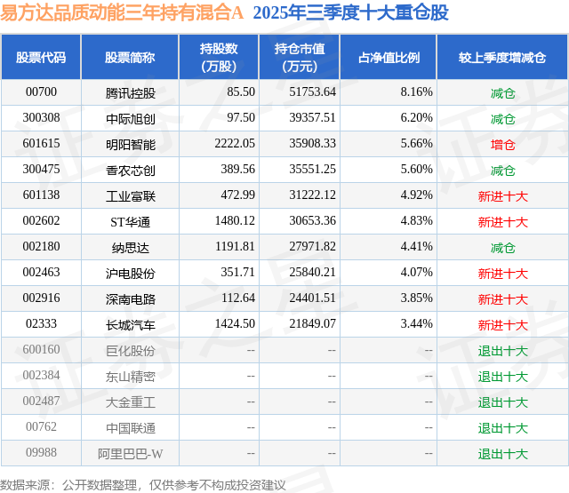 易方达品质动能三年持有混合A的前十大重仓股如下: