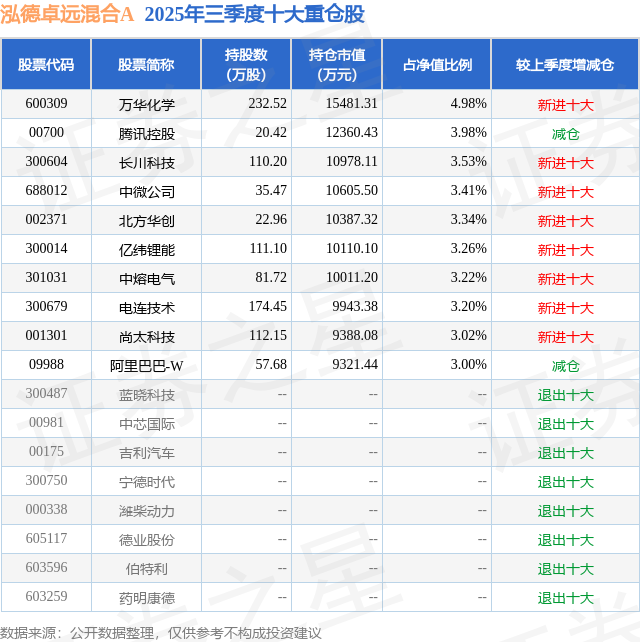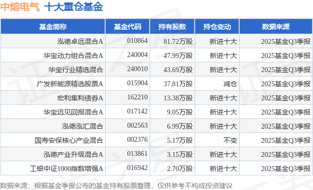 根据2025基金Q3季报公募基金重仓股数据,重仓该股的公募基金共17家,其中持有数量最多的公募基金为泓德基金的泓德卓远混合A。泓德卓远混合A目前规模为22.93亿元,最新净值0.7867(11月6日),较上一交易日上涨1.77%,近一年上涨37.51%。该公募基金现任基金经理为于浩成。于浩成在任的基金产品包括:泓德泓汇混合,管理时间为2021年1月21日至今,期间收益率为3.48%;泓德产业升级混合A,管理时间为2022年2月8日至今,期间收益率为3.47%。