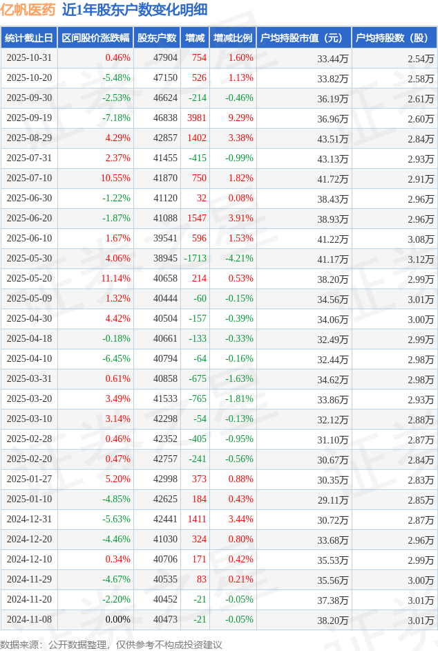 从股价来看,2025年10月20日至2025年10月31日,亿帆医药区间涨幅为0.46%,在此期间股东户数增加754.0户,增幅为1.6%。