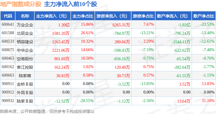 资金流向方面,地产指数(000006)成份股当日主力资金净流出合计7560.41万元,游资资金净流入合计1.05亿元,散户资金净流出合计2931.86万元。成份股资金流向详情见下表: