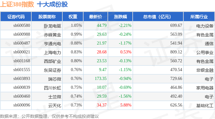 证券之星消息,11月7日,上证380(000009)指数报收于6563.85点,跌0.11%,成交1776.94亿元,换手率1.75%。当日该指数成份股中,上涨的有177家,金晶科技以8.26%的涨幅领涨,下跌的有192家,复旦微电以4.85%的跌幅领跌。