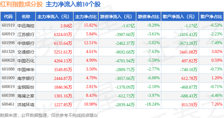 资金流向方面,红利指数(000015)成份股当日主力资金净流出合计3.65亿元,游资资金净流出合计3.09亿元,散户资金净流入合计6.73亿元。成份股资金流向详情见下表: