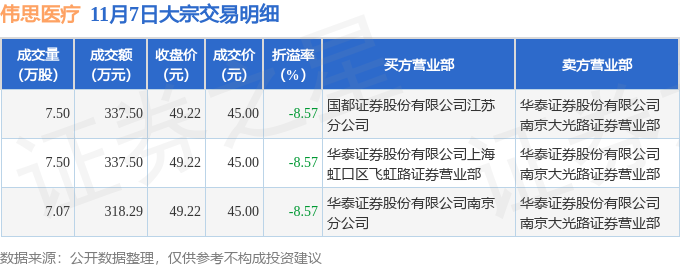 证券之星消息,11月7日伟思医疗发生大宗交易,交易数据如下: