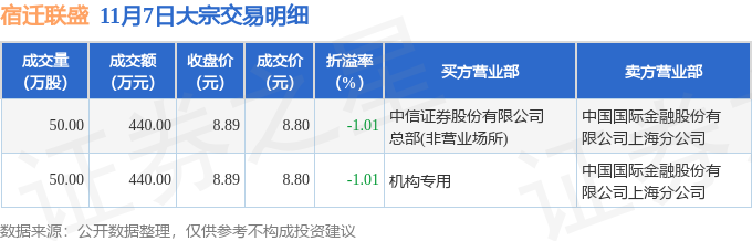 证券之星消息,11月7日宿迁联盛发生大宗交易,交易数据如下: