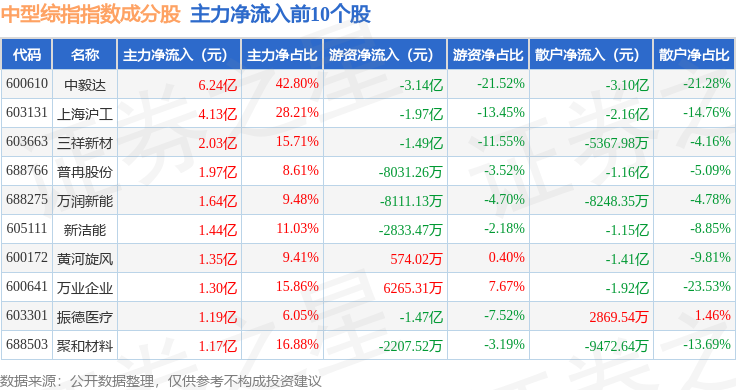 资金流向方面,中型综指(000020)指数成份股当日主力资金净流出合计35.37亿元,游资资金净流入合计8.07亿元,散户资金净流入合计27.31亿元。成份股资金流向详情见下表: