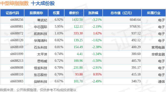 中型综指(000020)指数十大成份股详情如下: