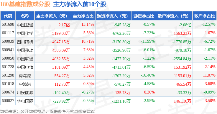 资金流向方面,180基建(000025)指数成份股当日主力资金净流出合计3.71亿元,游资资金净流出合计2311.24万元,散户资金净流入合计3.94亿元。成份股资金流向详情见下表:
