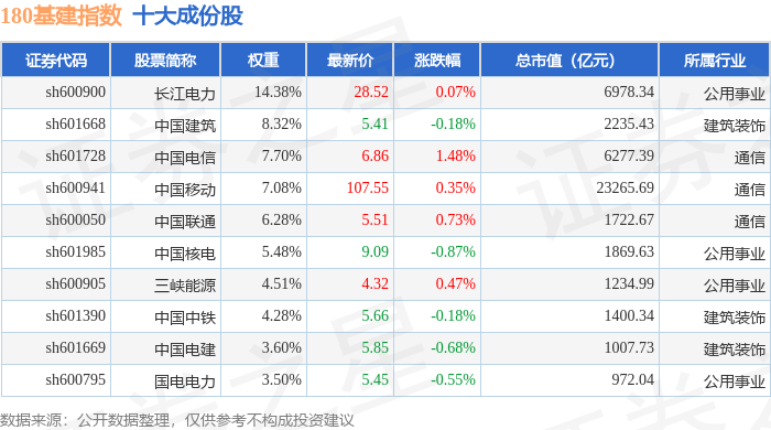 证券之星消息,11月7日,180基建(000025)指数报收于1856.85点,涨0.18%,成交166.23亿元,换手率0.46%。当日该指数成份股中,上涨的有14家,中国卫通以3.38%的涨幅领涨,下跌的有14家,桂冠电力以1.21%的跌幅领跌。