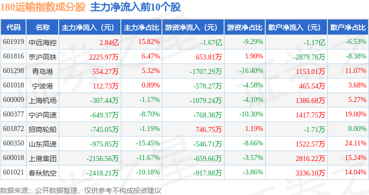 资金流向方面,180运输(000027)指数成份股当日主力资金净流入合计383.63万元,游资资金净流出合计7358.41万元,散户资金净流入合计6974.79万元。成份股资金流向详情见下表: