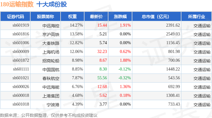 证券之星消息,11月7日,180运输(000027)指数报收于778.72点,涨0.54%,成交57.01亿元,换手率0.36%。当日该指数成份股中,上涨的有6家,中远海控以1.91%的涨幅领涨,下跌的有4家,宁沪高速以0.65%的跌幅领跌。