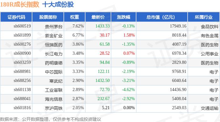证券之星消息,11月7日,180R成长(000030)指数报收于2615.56点,跌0.37%,成交2294.95亿元,换手率0.9%。当日该指数成份股中,上涨的有57家,合盛硅业以10.01%的涨幅领涨,下跌的有69家,拓普集团以5.47%的跌幅领跌。