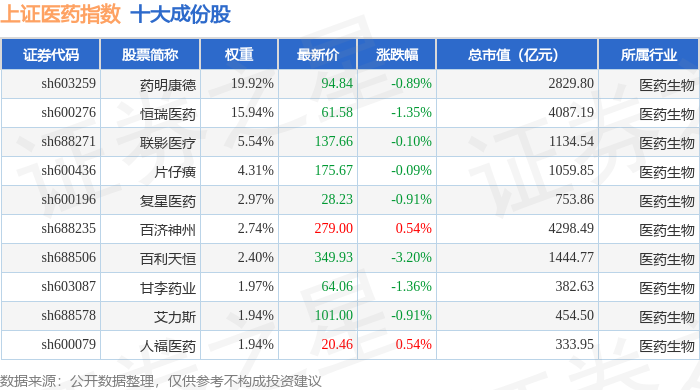 上证医药(000037)指数十大成份股详情如下: