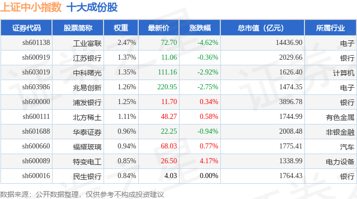 证券之星消息,11月7日,上证中小(000046)指数报收于5200.94点,跌0.25%,成交3613.61亿元,换手率1.27%。当日该指数成份股中,上涨的有190家,合盛硅业以10.01%的涨幅领涨,下跌的有244家,拓普集团以5.47%的跌幅领跌。