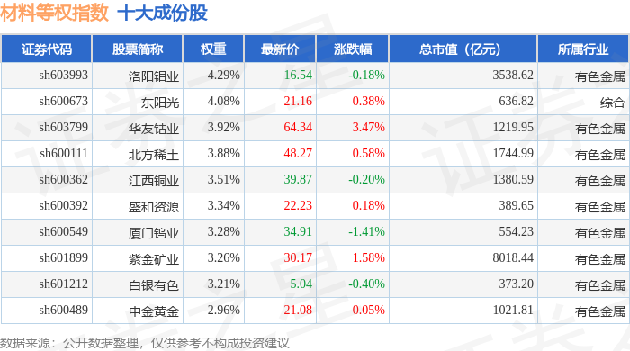 证券之星消息,11月7日,材料等权(000071)指数报收于4548.25点,涨0.88%,成交720.2亿元,换手率2.03%。当日该指数成份股中,上涨的有33家,合盛硅业以10.01%的涨幅领涨,下跌的有17家,西部超导以3.27%的跌幅领跌。