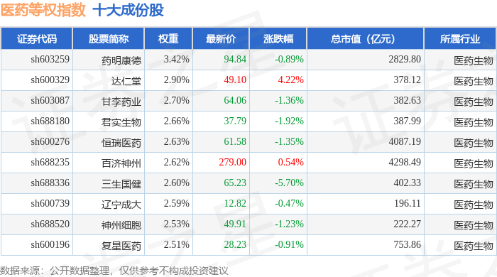 证券之星消息,11月7日,医药等权(000075)指数报收于7299.35点,跌0.21%,成交166.42亿元,换手率0.87%。当日该指数成份股中,上涨的有27家,达仁堂以4.22%的涨幅领涨,下跌的有23家,三生国健以5.7%的跌幅领跌。