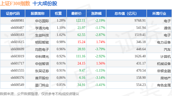 证券之星消息,11月7日,上证F300(000099)指数报收于9264.7点,涨0.04%,成交1665.03亿元,换手率1.55%。当日该指数成份股中,上涨的有145家,弘元绿能以10.01%的涨幅领涨,下跌的有139家,拓普集团以5.47%的跌幅领跌。