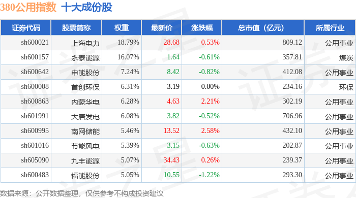 证券之星消息,11月7日,380公用(000113)指数报收于3253.76点,涨0.06%,成交81.38亿元,换手率1.52%。当日该指数成份股中,上涨的有8家,南网储能以2.58%的涨幅领涨,下跌的有8家,涪陵电力以2.54%的跌幅领跌。