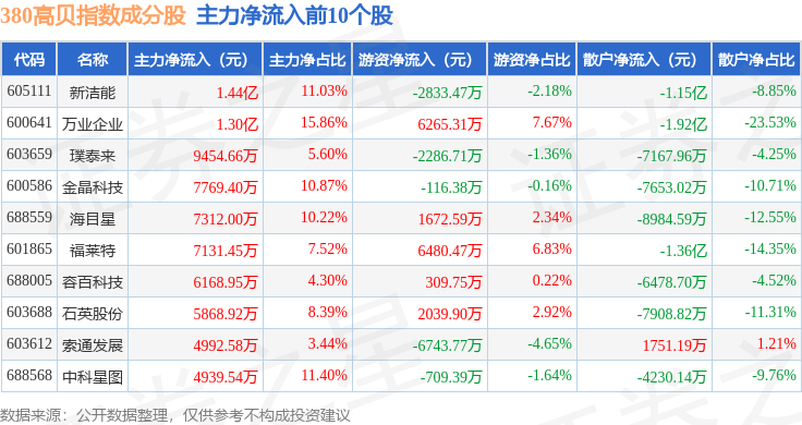 资金流向方面,380高贝(000137)指数成份股当日主力资金净流出合计9.21亿元,游资资金净流入合计6.61亿元,散户资金净流入合计2.6亿元。成份股资金流向详情见下表: